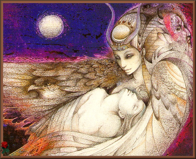 Mythologically, at Herfest/Mabon, the Sun King is interred. The Goddess laments the loss of her Consort and descends to the Underworld in search of him. There she encounters the Dark God and submits to him. The two are united, representing the union of Thanatos (death) and Eros (love). However, the Dark God is sterile, so no child can be born from their union. In another version, the Dark Child is conceived. The Goddess assumes the aspect of the Dark Queen.